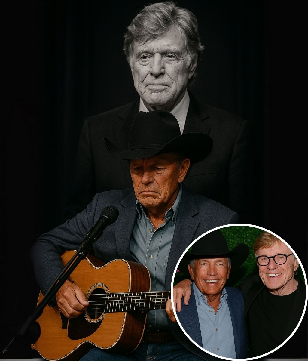 A Song for Redford — George Strait’s Silent Farewell No one expected the tears. No one foresaw the tremble in his voice. Before 80,000 beating hearts — and millions watching across America — George Strait walked slowly to center stage. He clutched his guitar to his chest, his hands unsteady, eyes lowered as if drawing strength from somewhere deep within. No introduction. No spectacle. Just a heavy silence, waiting to be broken. Then, under a single spotlight, the music began. It wasn’t a tribute to a cowboy on the silver screen, but to a real-life legend: Robert Redford. George’s voice, low and weighted, rose like a prayer through the stillness. That night brought no fireworks, no flashing screens. Only a man — vulnerable yet resolute — offering farewell to another, through the one language that transcends all barriers: song.