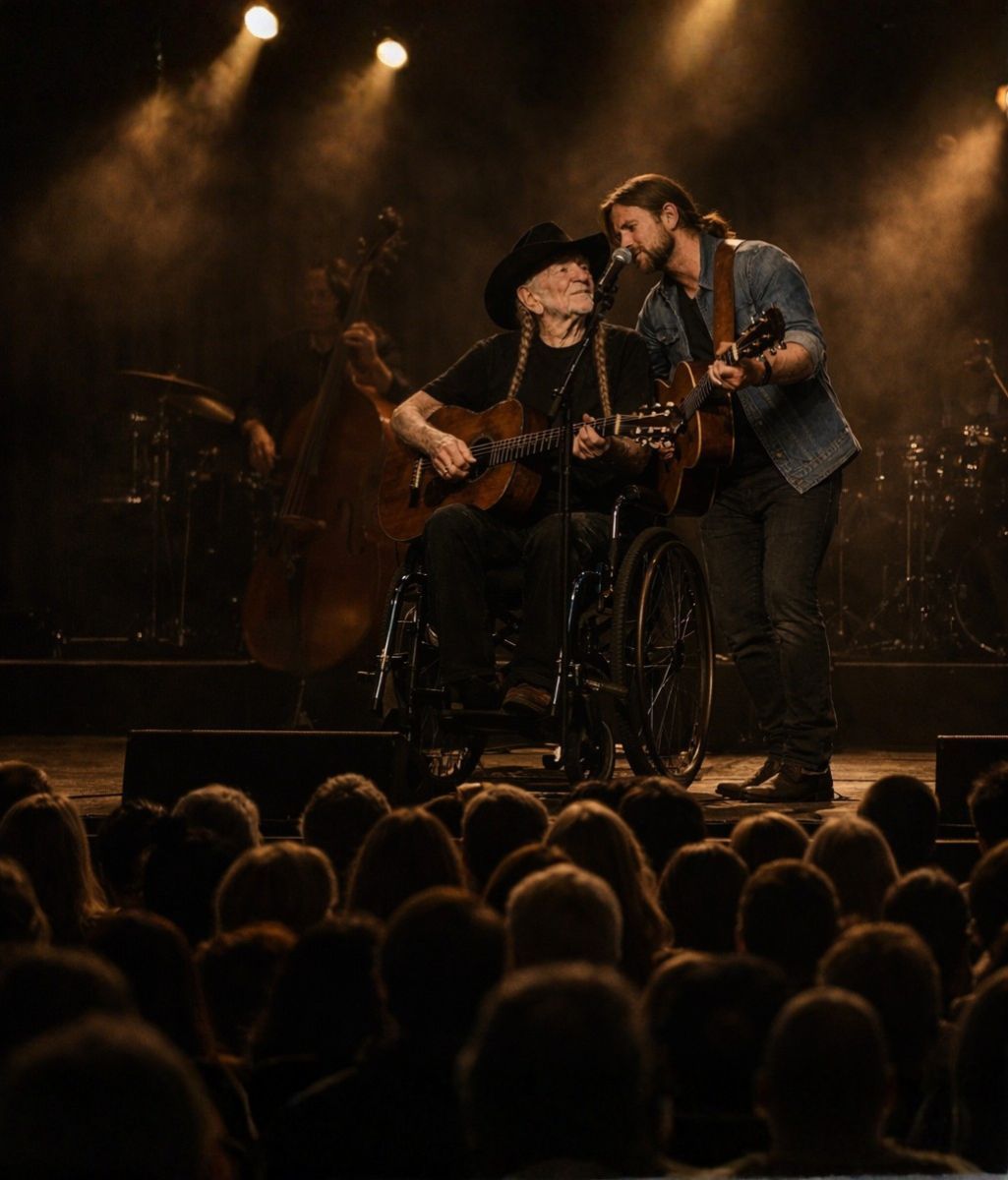 The silence that fell over Nashville was not planned. It was instinctive. The kind of silence that arrives when people sense they are witnessing something too honest to interrupt. The lights softened, the crowd stilled, and there sat Willie Nelson, quietly grounded in a wheelchair beneath the warm glow of the stage. No announcement framed the moment. No explanation was offered. None was needed.
