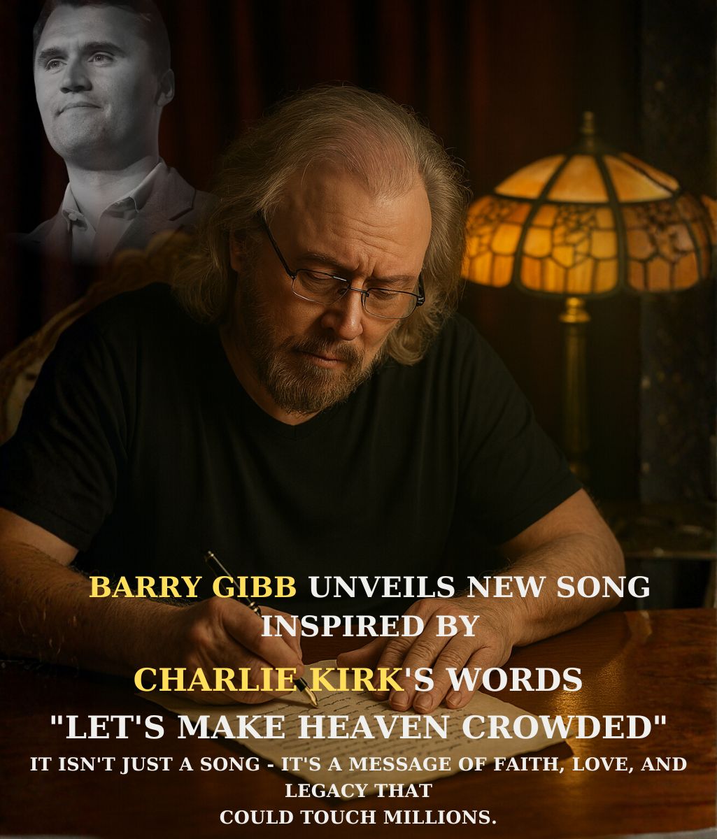 At 79 years old, music legend Barry Gibb has once again moved the world — not with a grand comeback or glittering event, but with something far more intimate: a song that feels like a prayer. Quietly released without fanfare, his new piece, inspired by Charlie Kirk’s phrase “Let’s Make Heaven Crowded,” has already captured hearts across the globe. Within hours of its debut, fans described it as “haunting,” “soul-stirring,” and “one of the most emotional performances of his life.”