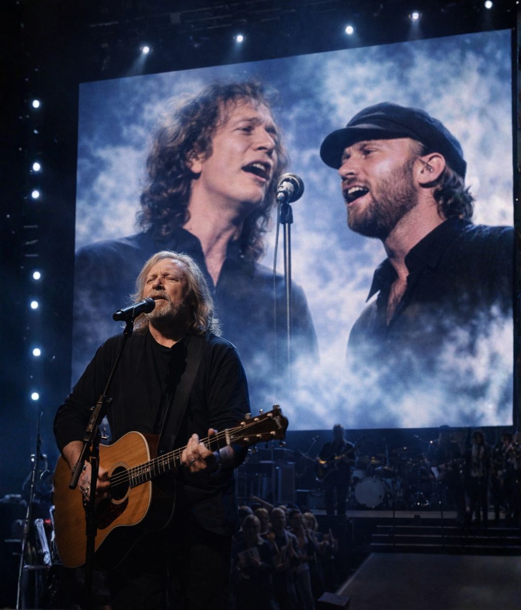 The piece had been written in the language the Bee Gees always trusted most: harmony shaped by memory. As Barry began to sing, the room understood immediately that this was not an attempt to summon the past, but to honor it. The melody moved gently, leaving space where voices once stood beside his — the unmistakable presence of Robin Gibb and Maurice Gibb, not heard as sound, but felt as structure.
