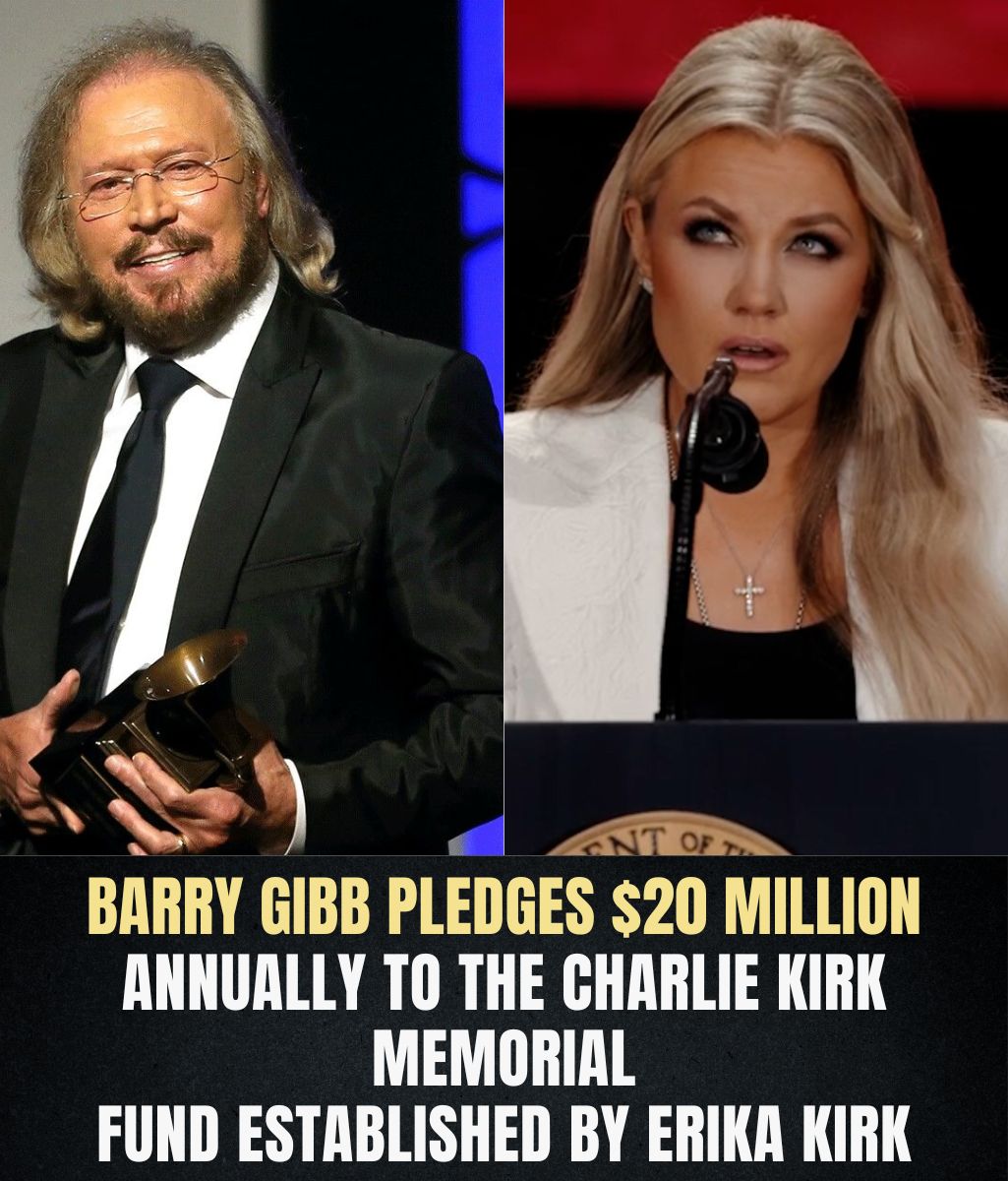 In a stunning and heartfelt announcement that has captured the attention of the world, Barry Gibb, the legendary voice of the Bee Gees, has pledged $20 million annually to the Charlie Kirk Memorial Fund — an organization founded by Erika Kirk to carry forward her late husband’s enduring mission of faith, patriotism, and purpose.