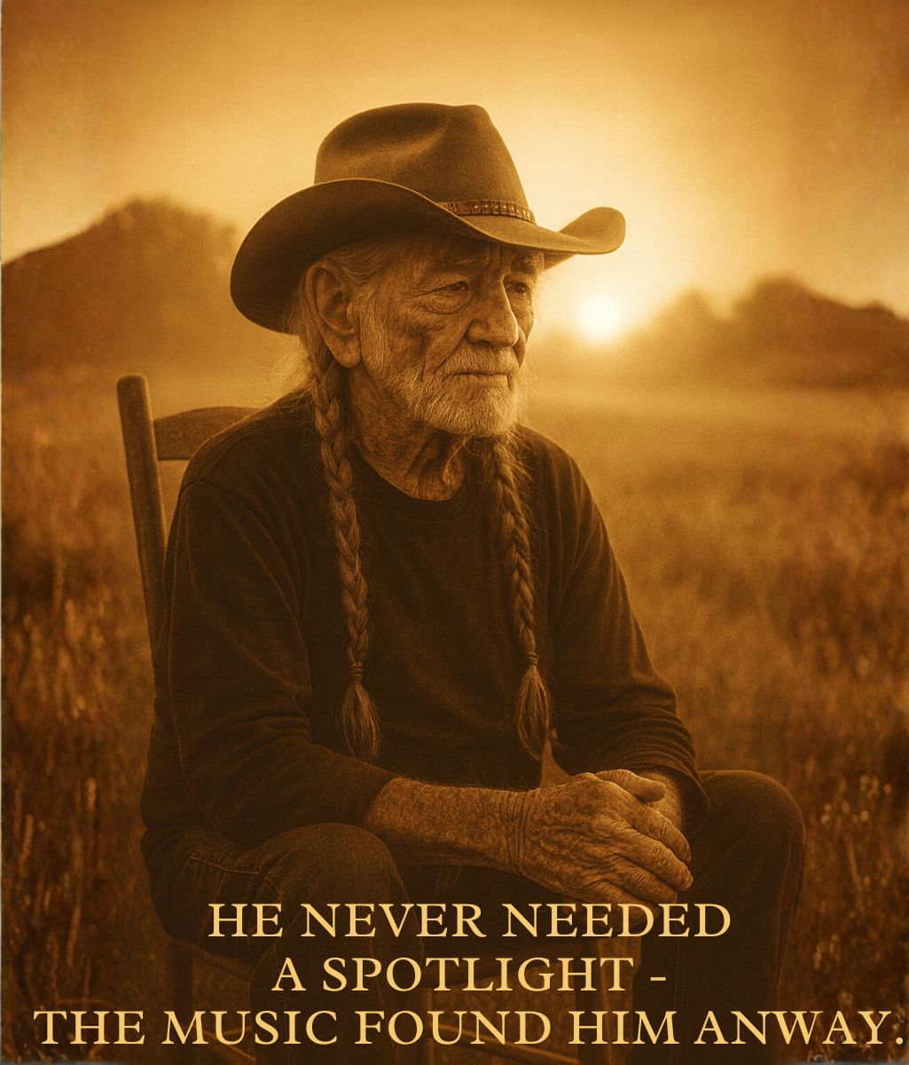 HE NEVER NEEDED A SPOTLIGHT — THE MUSIC FOUND HIM ANYWAY. Willie Nelson was never chasing applause — he was chasing truth. While others roared through fame and fireworks, Willie let silence and sincerity do the work. His voice — rough as gravel yet warm as sunrise — carried stories that felt like home: dust on the boots, love that lingers, and prayers whispered through the wind. When he sang, it wasn’t performance — it was confession. Each note felt lived-in, like the scent of cedar and rain clinging to old guitar strings. No glitter. No spectacle. Just the kind of honesty that sneaks past your ears and settles deep in your heart. They say legends burn bright — but Willie doesn’t. He glows. Steady. Unshakable. The kind of light that never blinds, only guides. Because long after the crowd goes home, his voice still drifts through the quiet — a reminder that some songs don’t fade; they simply become part of the night.