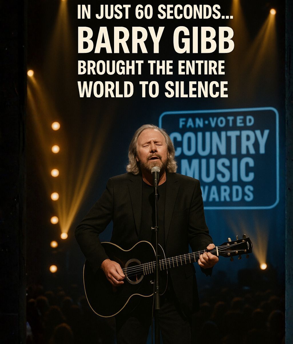 Under the brilliant lights of the Fan-Voted Country Music Awards, Barry Gibb stepped forward with no introduction, no music cue, and no explanation. One second the stage was empty… the next, the last surviving Bee Gee stood alone in the single white spotlight.