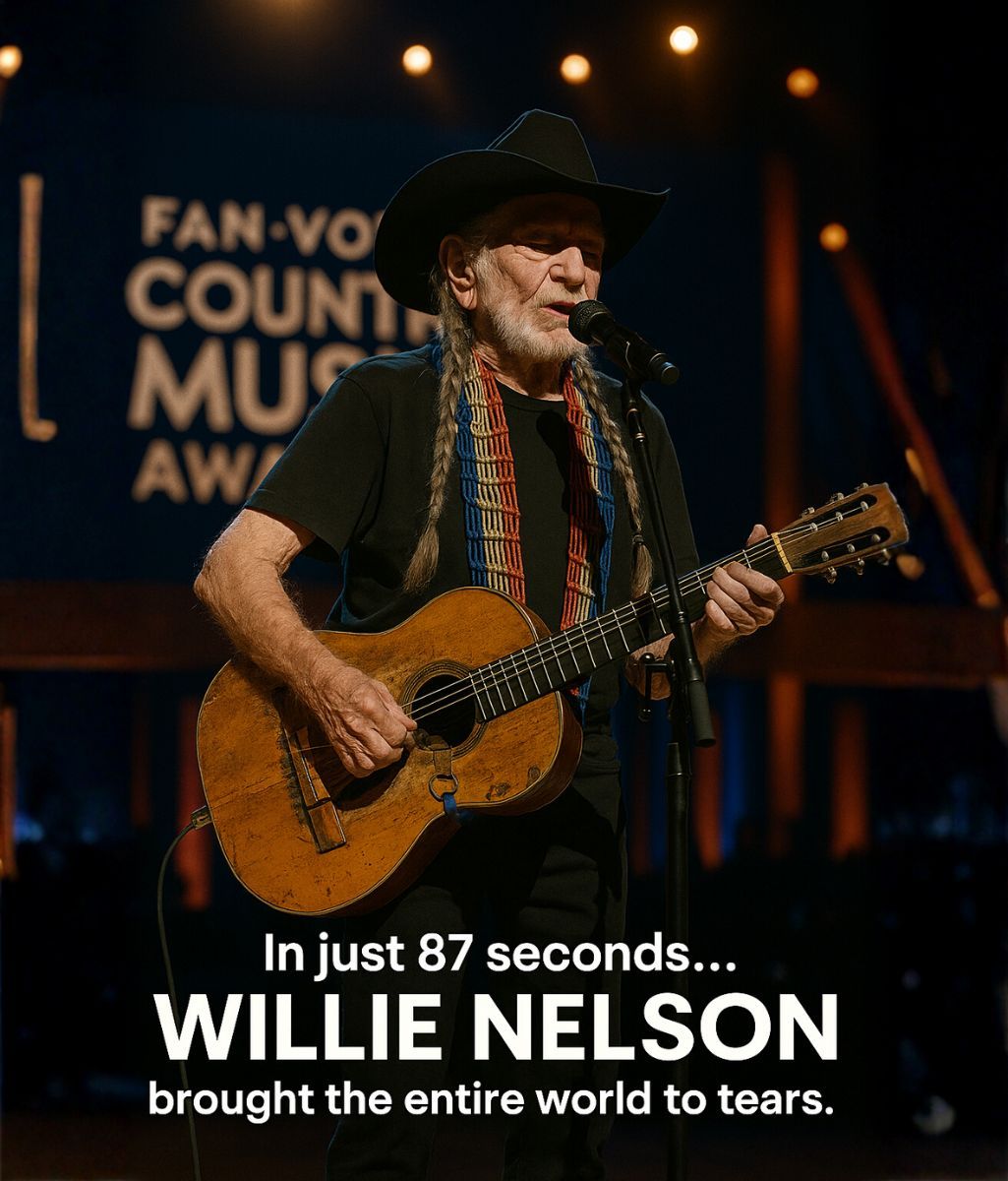 “In just 87 seconds… Willie Nelson brought the entire world to tears.”Standing beneath the bright lights of the Fan-Voted Country Music Awards, **Willie Nelson** stepped forward without warning — no announcement, no fanfare, just a 92-year-old legend facing what might be the final spotlight of his life. Fighting pain and fading strength, Willie stunned millions when he lifted Trigger and began to sing “Always on My Mind.” His voice wasn’t as strong as it once was — but every tremble, every breath, every fragile note carried 70 years of love, loss, and memory. And then… the chorus hit. The entire room shook as if time itself had paused.