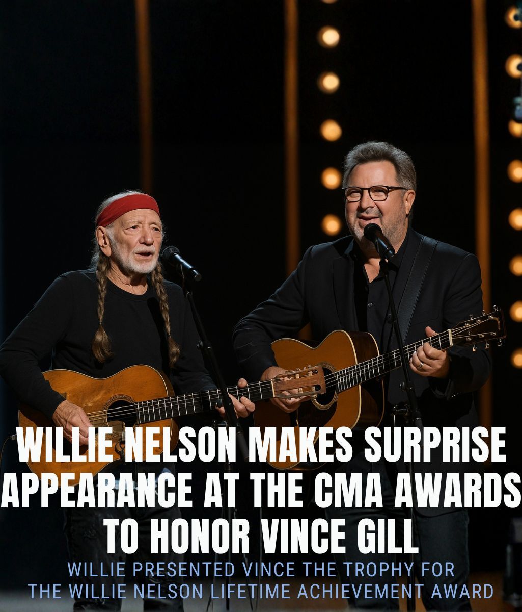 No one at the CMA Awards was prepared for what happened next. In a moment that seemed to freeze the entire ceremony, Willie Nelson — the quiet titan of American music — suddenly appeared onstage to honor Vince Gill, recipient of this year’s Willie Nelson Lifetime Achievement Award.