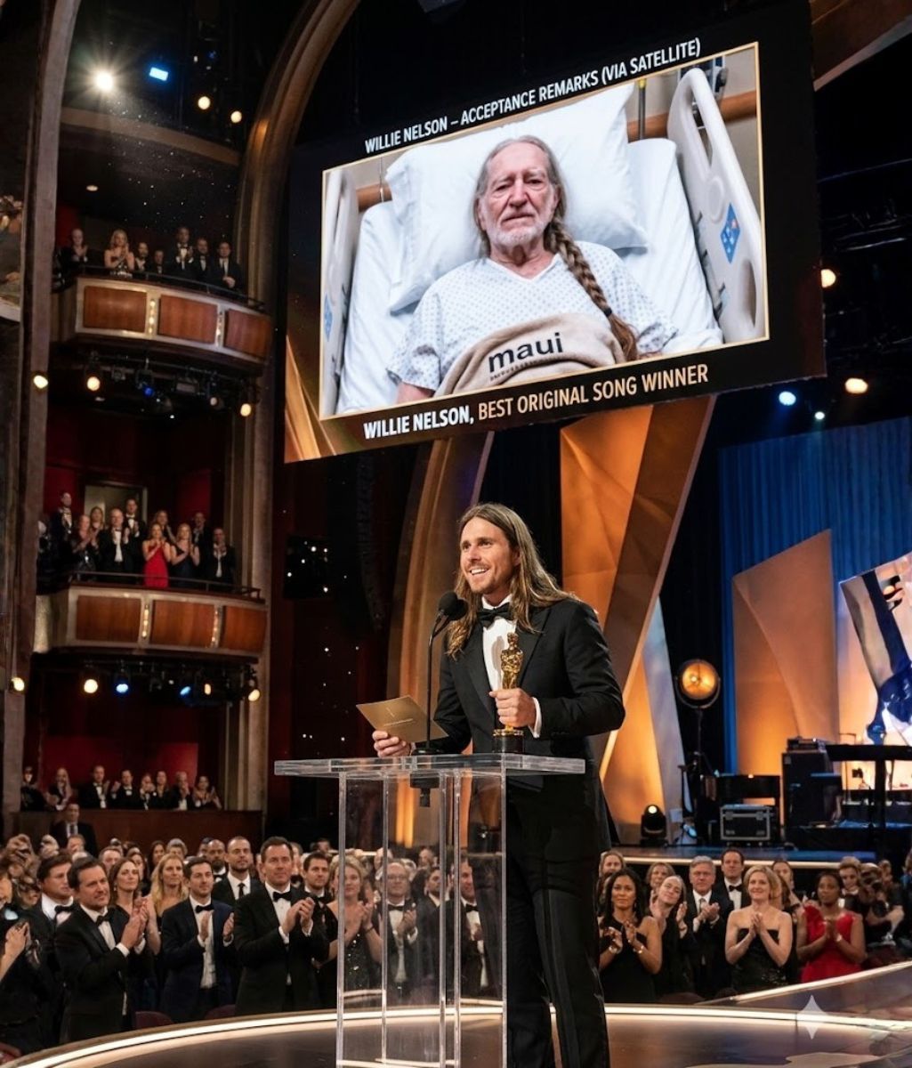 In a moment that no one fully expected, Lukas Nelson stepped onto the stage to accept an Academy Award on behalf of his father, the legendary Willie Nelson. What began as a standard awards presentation quickly transformed into one of the most emotional highlights of the night, leaving the audience in reflective silence.