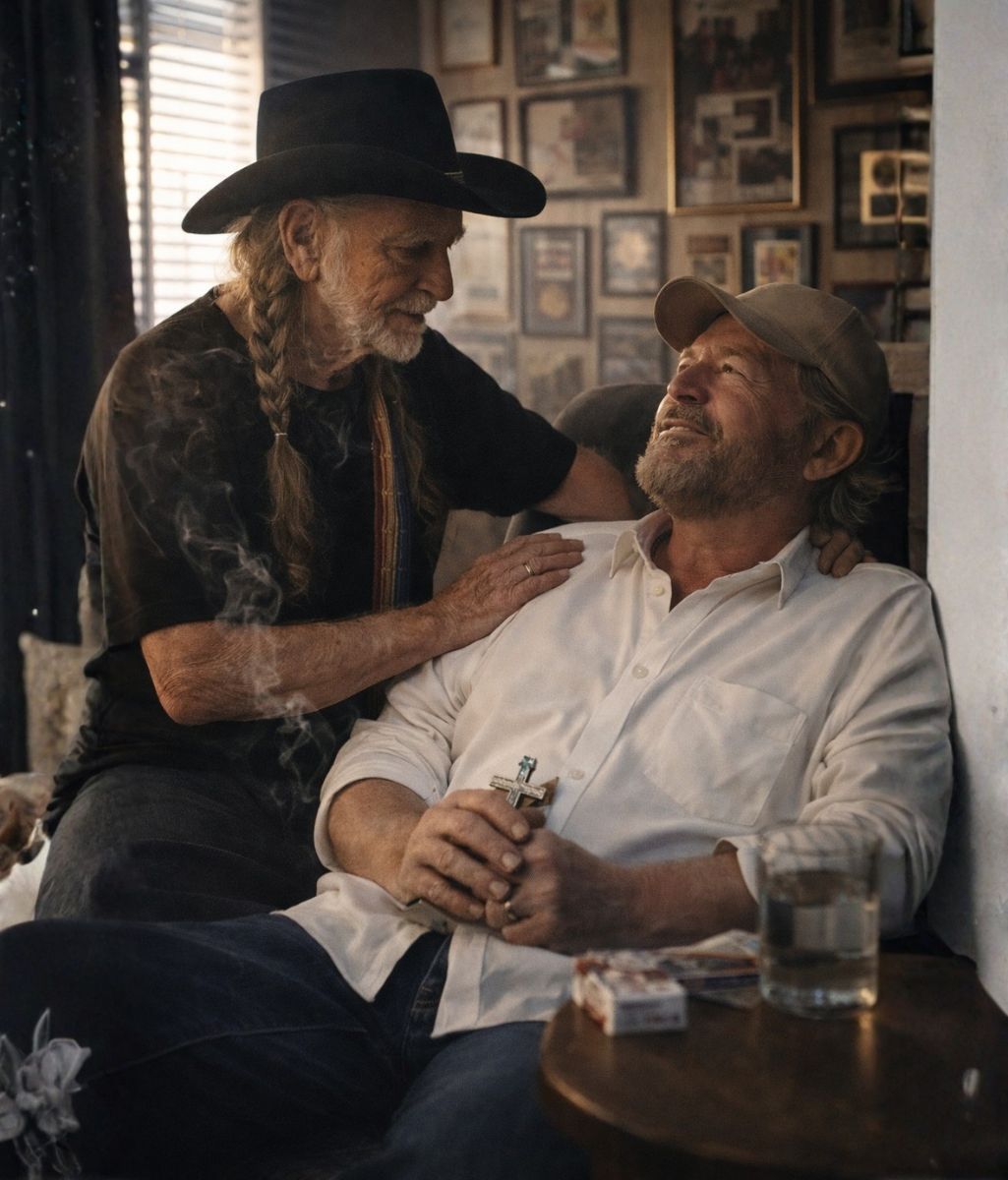 Willie didn’t answer. He didn’t need to. He placed a steady hand on his brother’s shoulder—an anchor without words. In that touch, the line between life and death blurred, held in place by shared roads and an understanding too old to explain. It was the kind of moment that doesn’t ask to be remembered. It simply is.