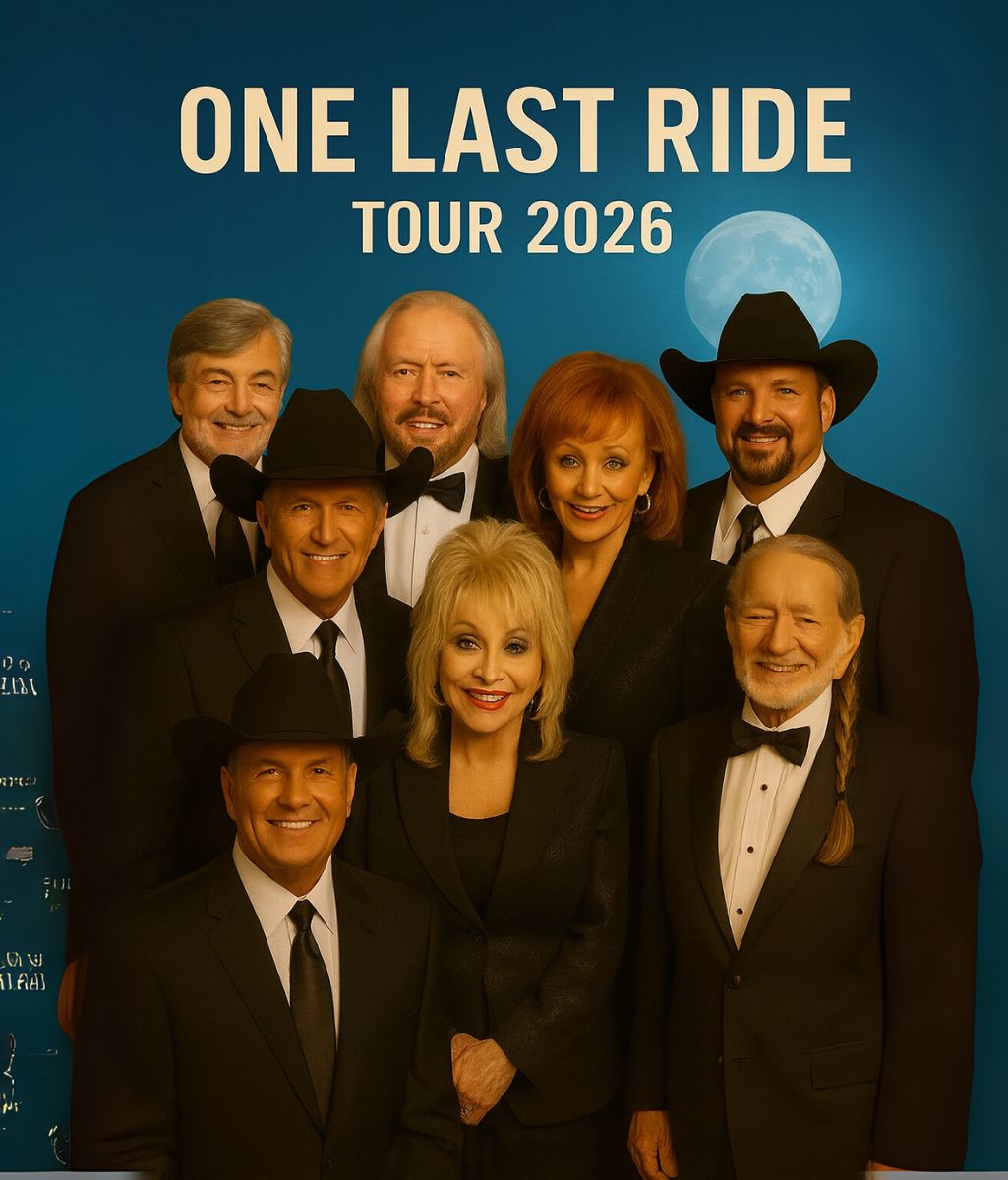 Picture it: a golden sunset spilling across a packed stadium, the hum of anticipation rising from tens of thousands of fans, and eight of America’s greatest voices stepping forward shoulder to shoulder. In 2026, the world will witness a moment that feels less like a tour and more like a monument. Randy Owen, George Strait, Alan Jackson, Reba McEntire, Garth Brooks, Willie Nelson, Dolly Parton, and Barry Gibb — eight giants whose songs have defined generations — will join forces for “One Last Ride.”