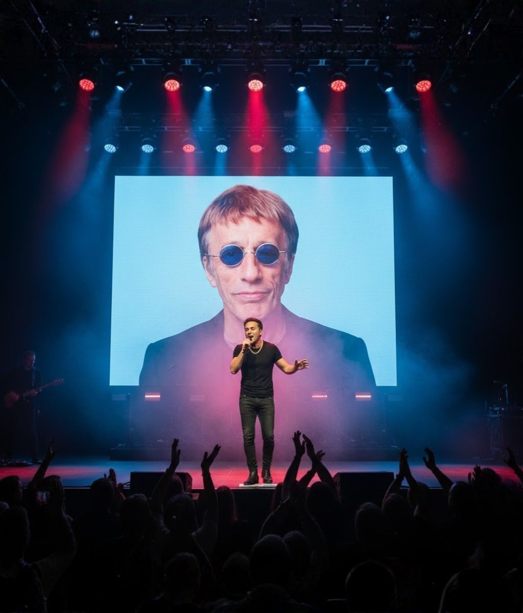 The lights dimmed to a soft amber glow as RJ Gibb stepped forward, alone, holding a microphone with both hands. There was no announcement, no buildup, just a quiet acknowledgment that something deeply personal was about to be shared. The song, he explained in a trembling breath, was one his father, Robin Gibb, had written late at night years ago — recorded once, never released, and quietly tucked away like a secret too fragile to revisit.