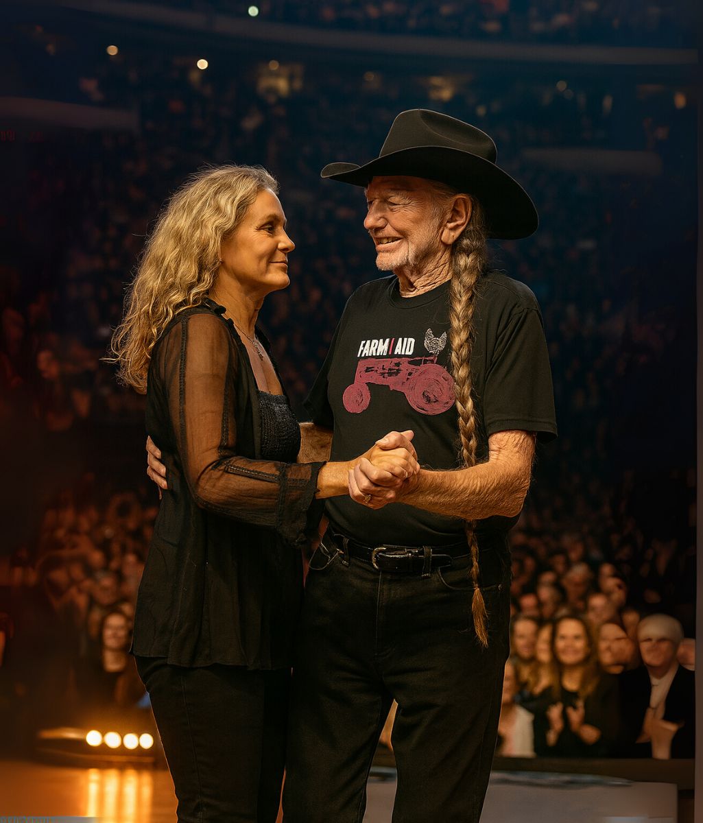 Then his eyes shifted. Not to the crowd. Not to the musicians waiting for his cue. Instead, he looked toward the edge of the stage, where his wife stood quietly in the shadows, almost hidden from view. With a smile too tender for the cameras to capture, Willie extended his hand. Gasps spread through the arena as she stepped into the spotlight beside him.