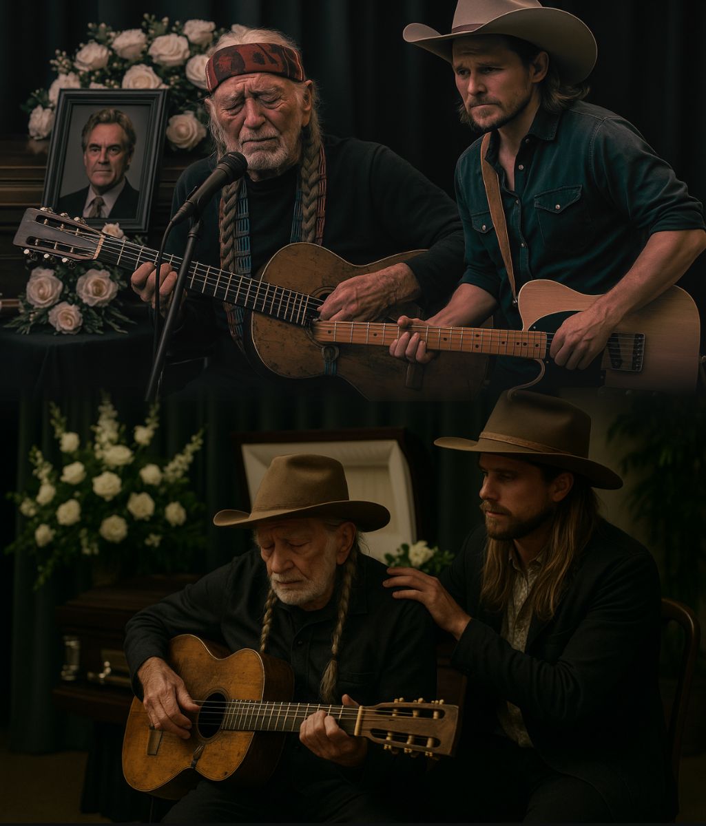 When the first notes rose, the chapel seemed to breathe as one. Willie’s voice, fragile yet still unmistakably rich with the dust and truth of a thousand roads, carried through the air like a prayer. Lukas’s harmony soon joined him, blending the wisdom of age with the strength of a new generation. Together, their voices became a single river — flowing with grief, love, and respect for a man whose artistry had touched the world.