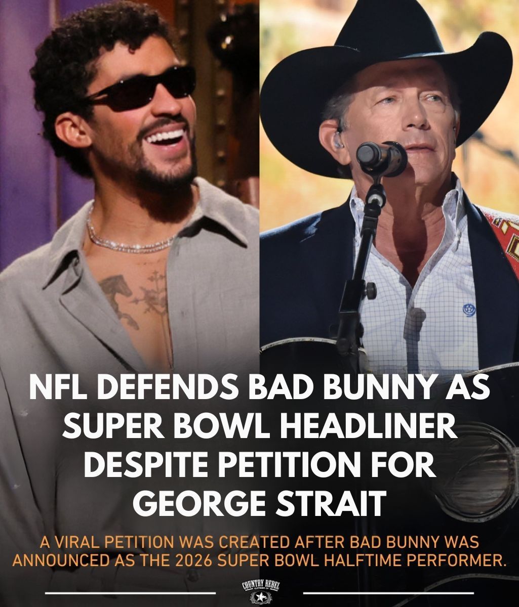 In one of the most controversial entertainment decisions in recent memory, the NFL has confirmed that Bad Bunny will remain the Super Bowl 2026 Halftime Show headliner, despite a growing national movement demanding that George Strait, the beloved “King of Country,” take his place. The decision has ignited a wave of outrage across the country, dividing fans and sparking heated debate over what — and who — truly represents the heart of American music.