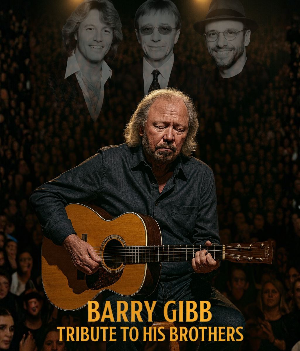 It was a moment no one could have prepared for — quiet, unexpected, and destined to live forever in the hearts of those who witnessed it. Under the soft amber glow of the stage lights, Barry Gibb paused mid-performance, his guitar resting against his chest as if the music itself needed a moment to breathe. Before him stood thousands, yet somehow, the arena felt weightless — as though time had folded in on itself.