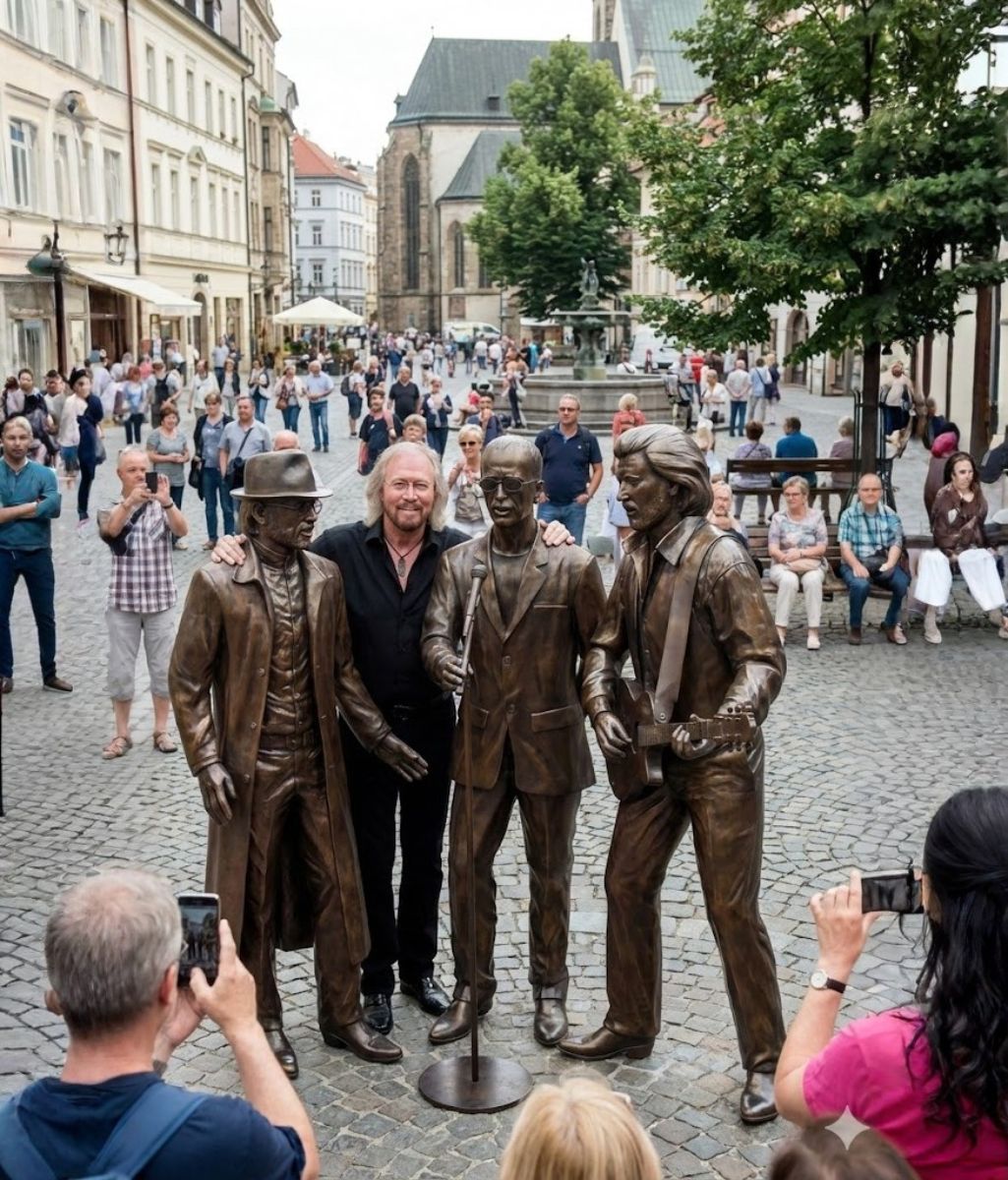 Standing beneath the open sky, Barry Gibb looked ahead — and smiled. His eyes locked onto the bronze figures before him, and in that instant, the years seemed to fall away. There they were. Not apart. Not remembered separately. But together — all three brothers, frozen in time at last.