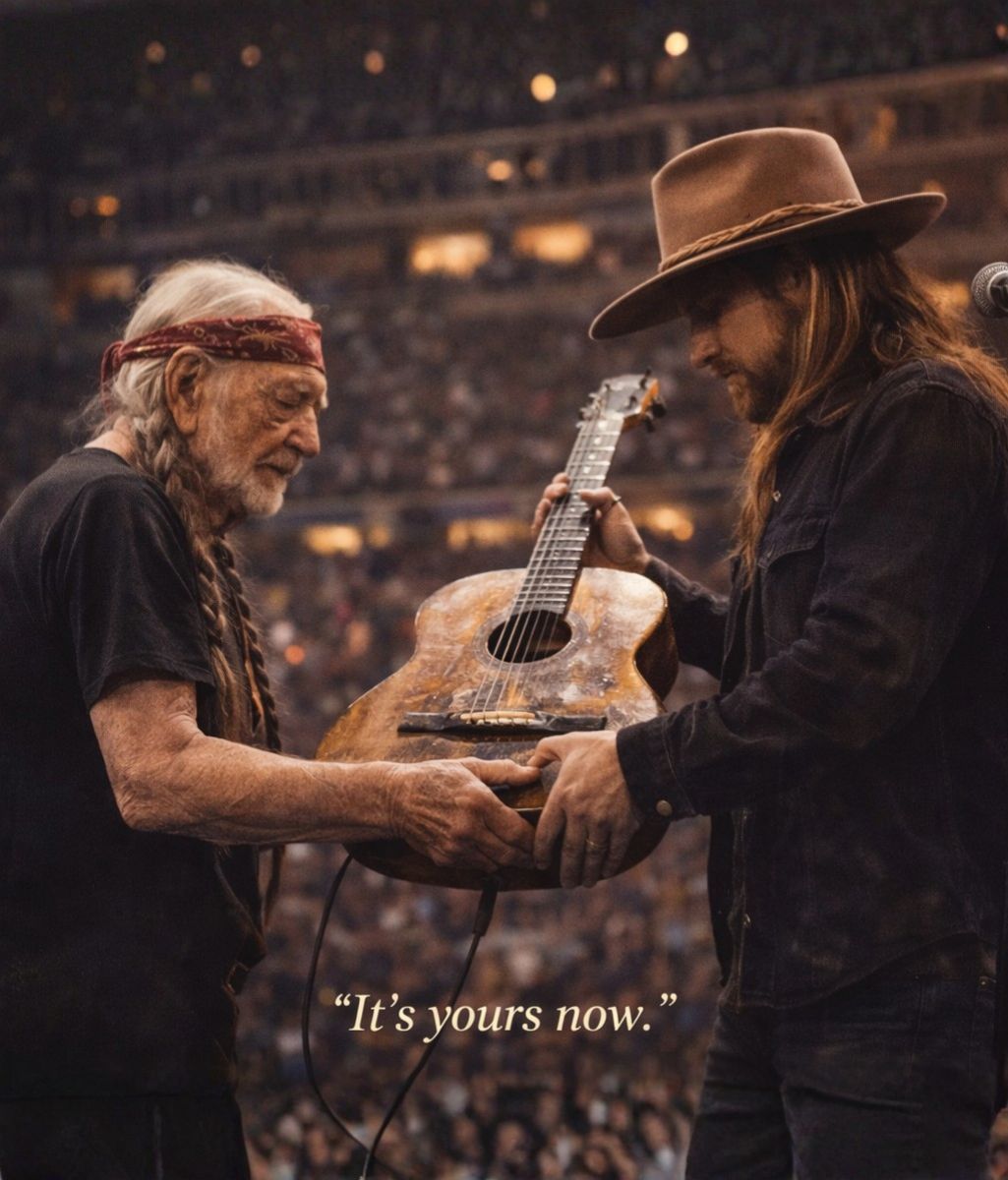 At 92, Willie Nelson did not end the night with volume or spectacle. He ended it with stillness. As the final notes faded, Willie remained at center stage, holding Trigger — the weathered guitar that had carried his voice, his faith, and his truth for more than half a century. Then, without ceremony, he unclasped the strap and turned toward his son.