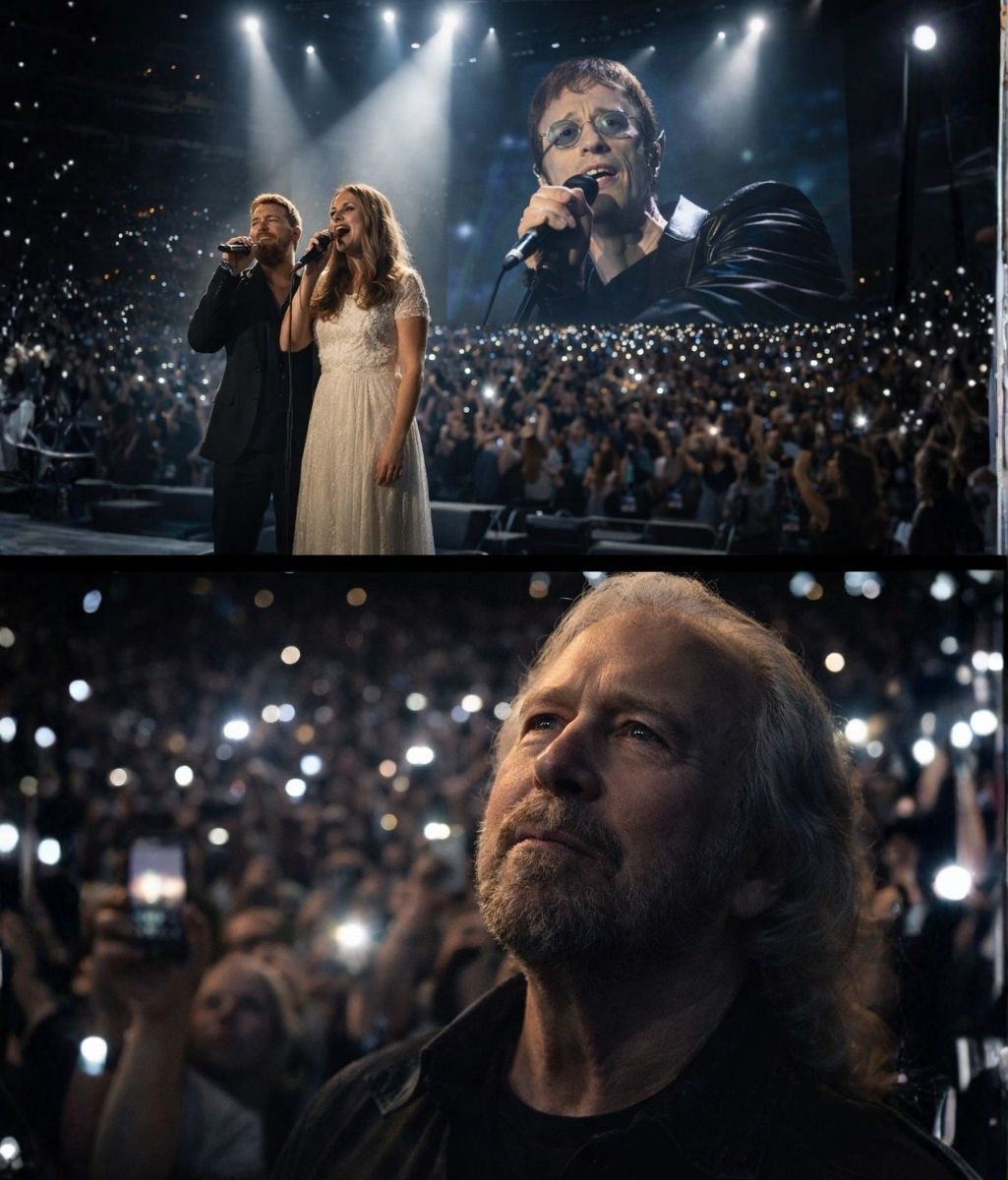 As the harmonies rose, Robin’s unmistakable falsetto seemed to lift with them — delicate, bright, achingly familiar — weaving through the song like a presence that refused to leave. It didn’t arrive loudly. It didn’t interrupt. It simply belonged, as if it had been waiting patiently for this exact moment to return.