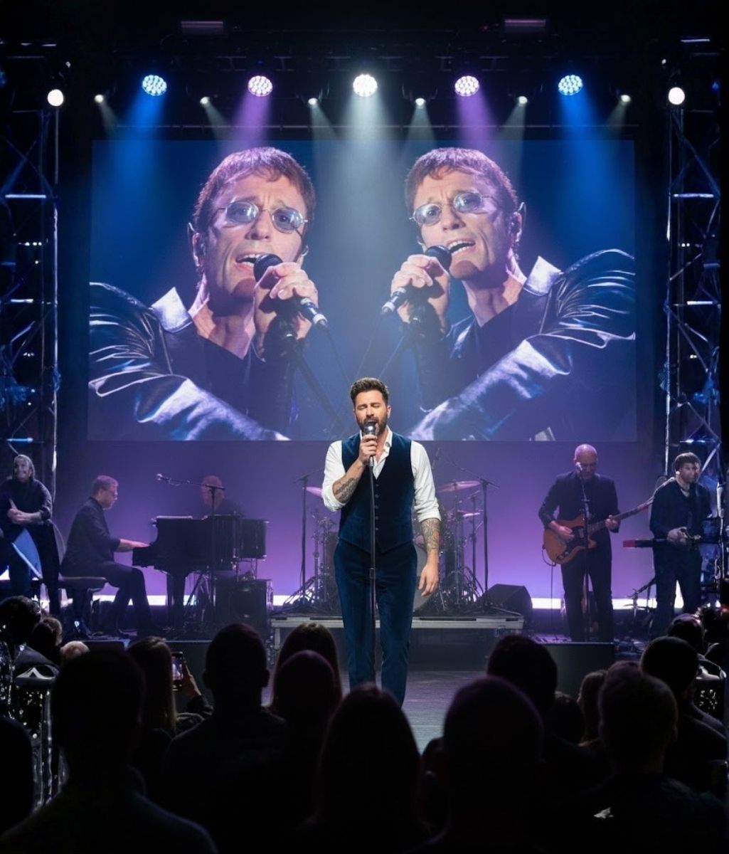 THE FIRST NOTE LANDED — AND THE ROOM LOST ITS BREATH. No one was ready for what followed when Spencer Gibb stepped to the microphone to sing a song the family never expected the world to hear. An unreleased track written by Robin Gibb, kept hidden for years. The lights dimmed. The guitar settled. Spencer began — and the air leaned in. His voice carried the unmistakable warmth of the Gibb bloodline. Fragile. Honest. Heavy with history. Then, halfway through the chorus, the impossible happened. Another voice rose — delicate, bright, achingly familiar. Robin’s voice. Clean. Young. Unmistakable. Joining his son in perfect harmony from a recording long believed lost. Gasps rippled through the room. Tears followed. What unfolded didn’t feel like a duet — it felt like a reunion across time. Backstage, Barry Gibb sank into a chair, overwhelmed as his brother’s voice wrapped itself around his nephew’s. Witnesses say he whispered something only family could understand. In that moment, music didn’t just remember. It reunited.