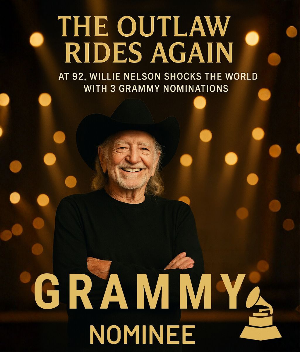 THE OUTLAW RIDES AGAIN: At 92, Willie Nelson Shocks the World With 3 Grammy Nominations — and the Songs Behind Them Will Break Your Heart. The country legend everyone thought had said his final goodbye just proved he’s far from done. Willie Nelson has been nominated for three Grammy Awards, including Best Country Album for *“The Border,” a soul-stirring record filled with reflections on love, loss, and the passage of time. His haunting rendition of “Made in Texas” earned a nod for Best Country Solo Performance, while the tender duet “Heaven’s Porch” — a tribute to late friends and fellow icons — secured a nomination for Song of the Year. Each track feels like a page torn from Willie’s life: raw, honest, and timeless. Fans say listening to it feels like sitting beside him on a quiet porch at sunset — where every note sounds like a prayer whispered to the wind.