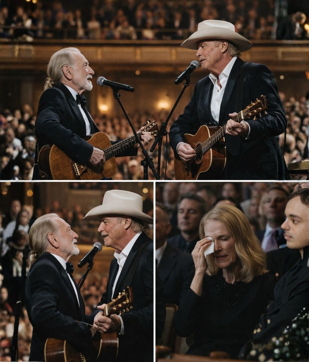 When Alan Jackson reached for Willie Nelson’s hand, the gesture carried more weight than any introduction ever could. It was not theatrical. It was steady. Grounded. The kind of touch that says everything words would only dilute. In that instant, the space between performer and witness dissolved. What remained was truth, standing quietly in the open.