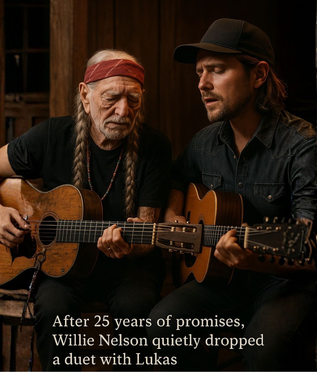 After 25 years of quiet promises and whispered hopes, Willie Nelson finally dropped the duet he recorded with Lukas Nelson… not in a studio, not under bright lights, but in the old cedar room on the ranch, long after everyone else had gone to bed.