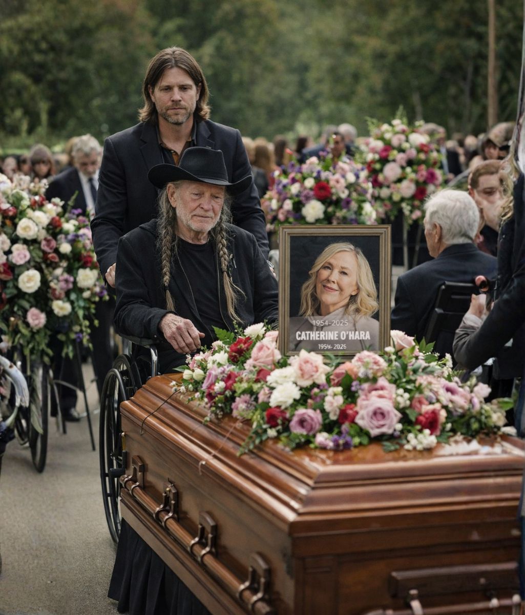 In this telling, there was no expectation they would appear. No line in a program. No quiet murmur warning the room. That was why everyone noticed. When Willie Nelson arrived quietly with Lukas Nelson at the funeral imagined for Catherine O’Hara, the atmosphere shifted without instruction.