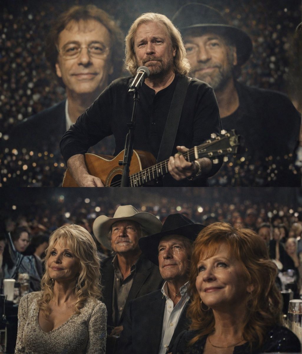 The piano answered first—softly, almost cautiously—as Barry Gibb brushed the keys. The sound was fragile and unguarded, the way truth often is when it’s allowed to appear without preparation. Behind him, memorial portraits of Robin Gibb and Maurice Gibb rested in quiet stillness, not looming, not dramatic—simply present.