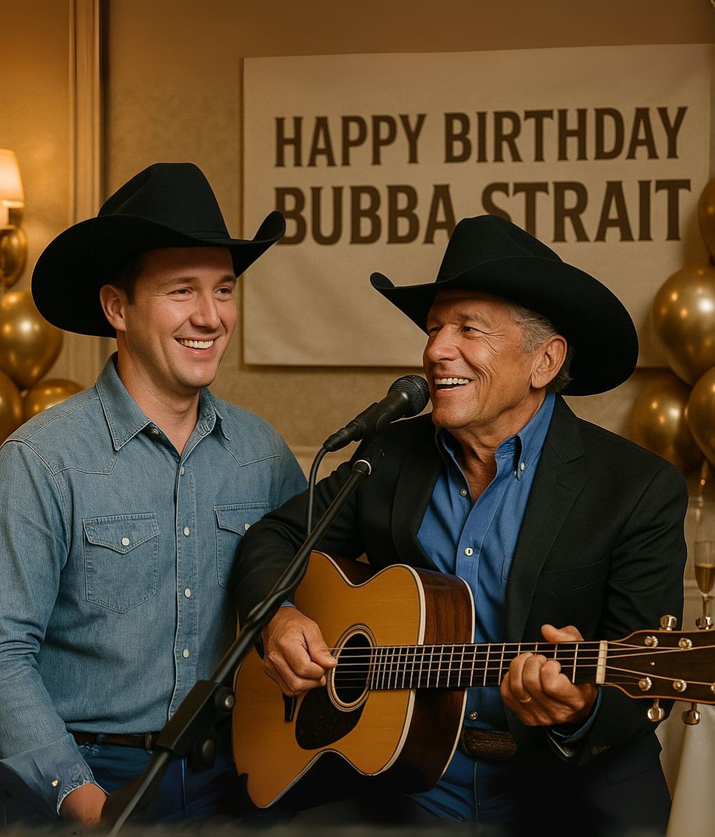 Picture this: it’s Bubba’s birthday. Instead of a lavish celebration or a grand show, the moment unfolds in the simplicity of home. George picks up his old acoustic guitar, its wood worn smooth from years of stories told through song. He doesn’t launch into one of his classic hits, the kind fans know by heart. Instead, he softly strums the opening chords of Bubba’s favorite song.