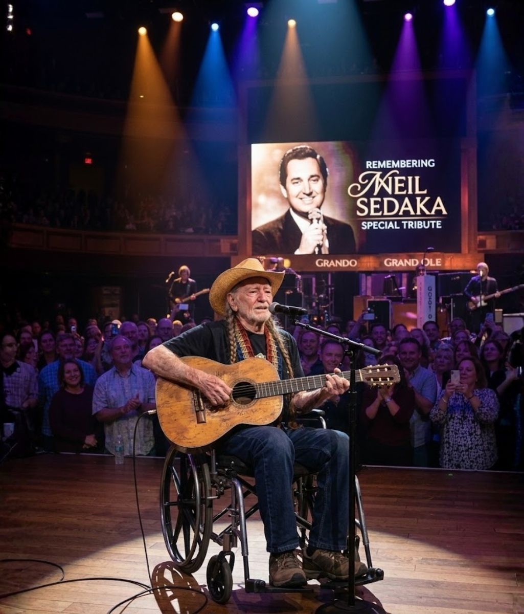 When Willie Nelson stepped into the spotlight to honor Neil Sedaka, no one expected the room to fall that silent. No big introduction. No grand speech. Just Willie’s weathered voice, soft but steady, carrying the melody of a legend who shaped generations